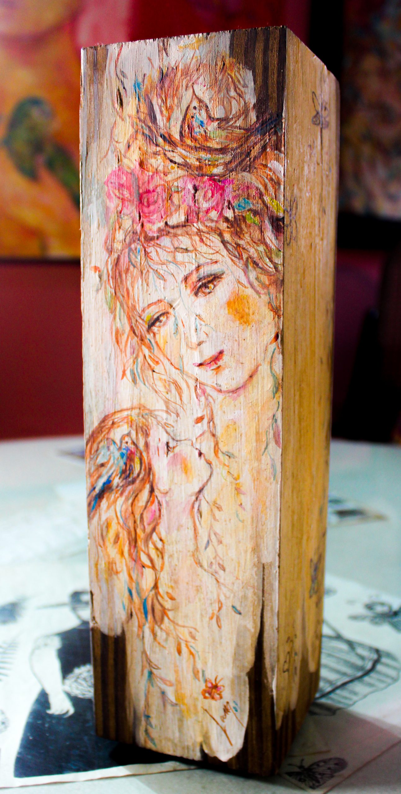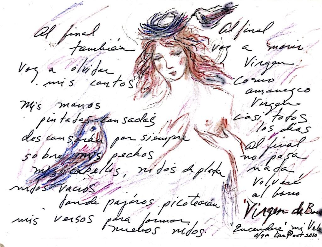 Aunque su medio principal es la pintura, a veces cambia de pincel a pluma con la que derrama sus sentimientos en el papel. La poesía viene casi natural para la artista, en la que describe sus vivencias, sueños, deseos y lo protagoniza su alma libre.